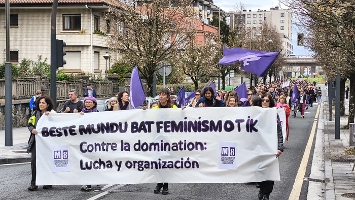 Bidasoaldean atzo milaka lagun batu ziren Martxoak 8 Emakumeen Eskubideen Eguna aldarrikatzeko eta ospatzeko. Pausuko Charles Pucheu plazatik abiatu eta Hondarribiko San Pedro kalean amaitu zen, 10 kilometro inguruko martxa. Bidean Hendaia eta Irungo jende andana bat bildu zen “Beste Mundu Bat Feminismotik” eraiki daitekeela aldarrikatzeko.